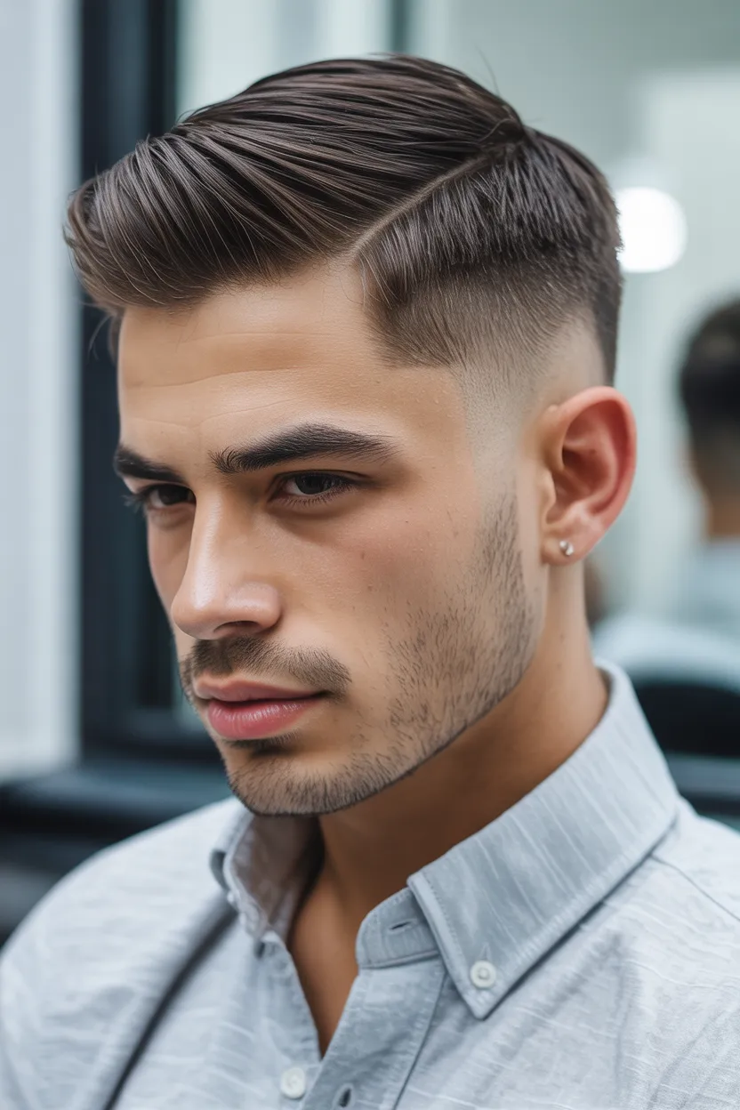 The side part fade blends a classic part with modern faded sides. That combination gives you a haircut that feels both mature and current.