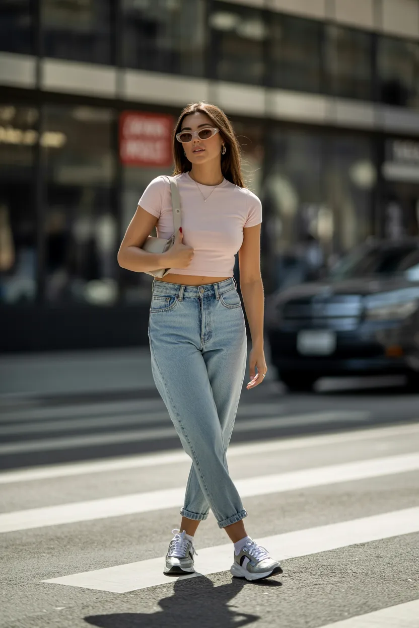 The key here is the fit. You want the tee to feel snug and slightly playful, whether it has a graphic on it or stays plain and simple. The jeans should sit low enough to give that Y2K feel, but they still need to flatter your shape and feel comfortable enough to wear outside your bedroom mirror test.