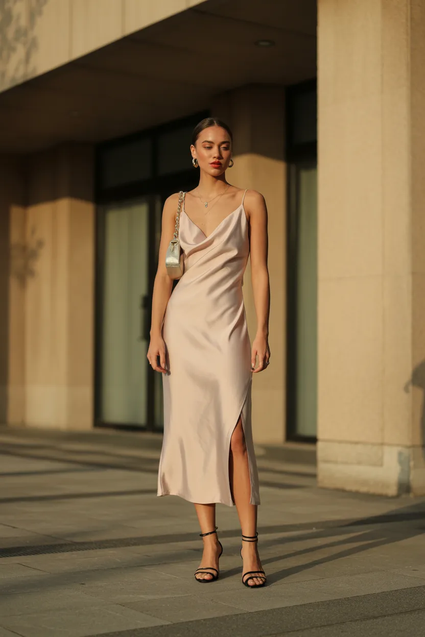 The beauty of a cami dress is how clean it looks. A satin finish, lace detail, or subtle print can make it feel even more Y2K. The bag adds that playful early 2000s detail that takes the outfit from simple to styled.