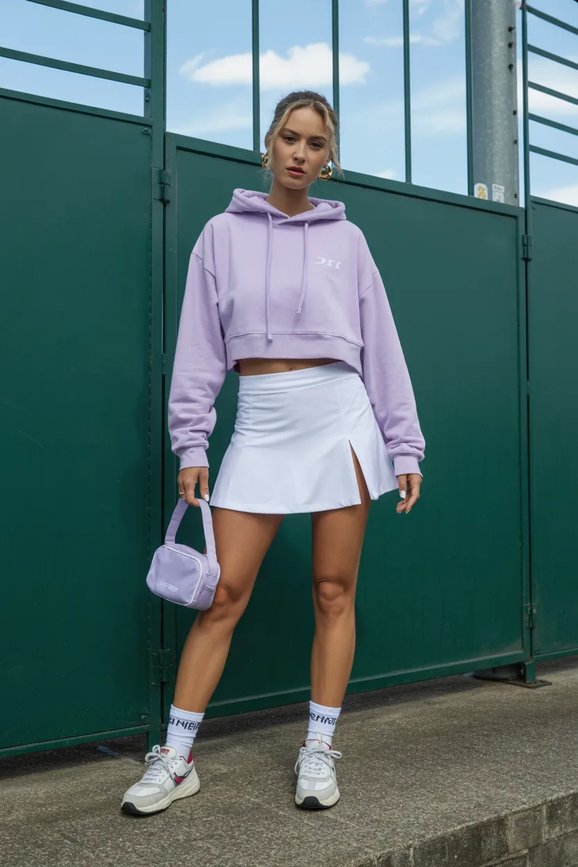 There is something very fun about this look because it feels easy but still put together. A cropped hoodie with a tennis skirt gives you that sporty Y2K energy that works well for real life.