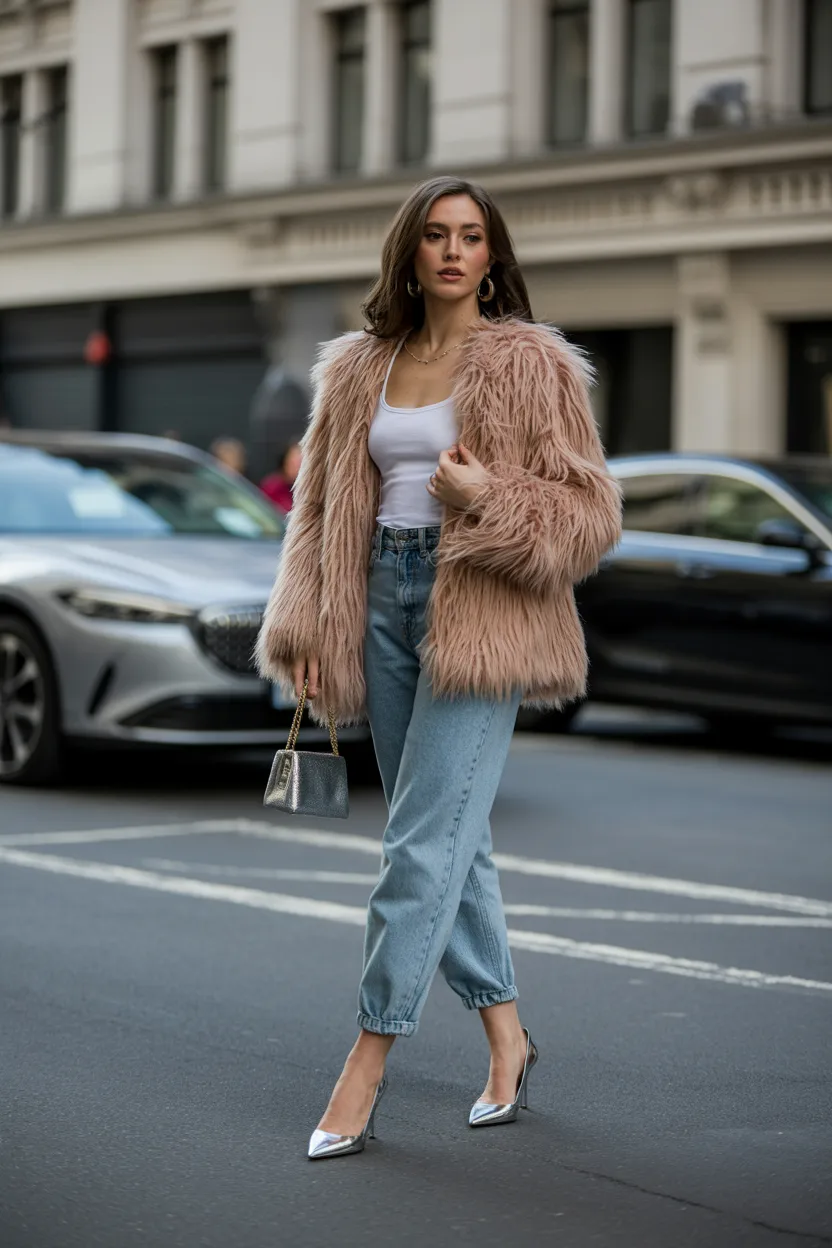 This outfit leans into the more glamorous side of Y2K fashion. A faux fur trim cardigan instantly gives the look more texture and drama, while jeans keep it wearable enough for real life. It feels a little extra, but that is part of the charm.
