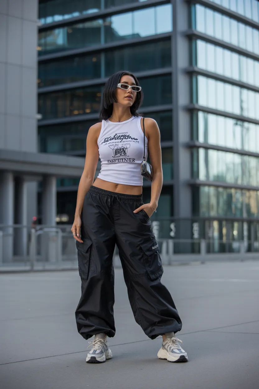 This is the kind of outfit that turns basic pieces into something more interesting. Add chunky sneakers and slim sunglasses to complete the look. A graphic tank with parachute pants feels bold and unmistakably Y2K, especially if you keep the accessories sleek.