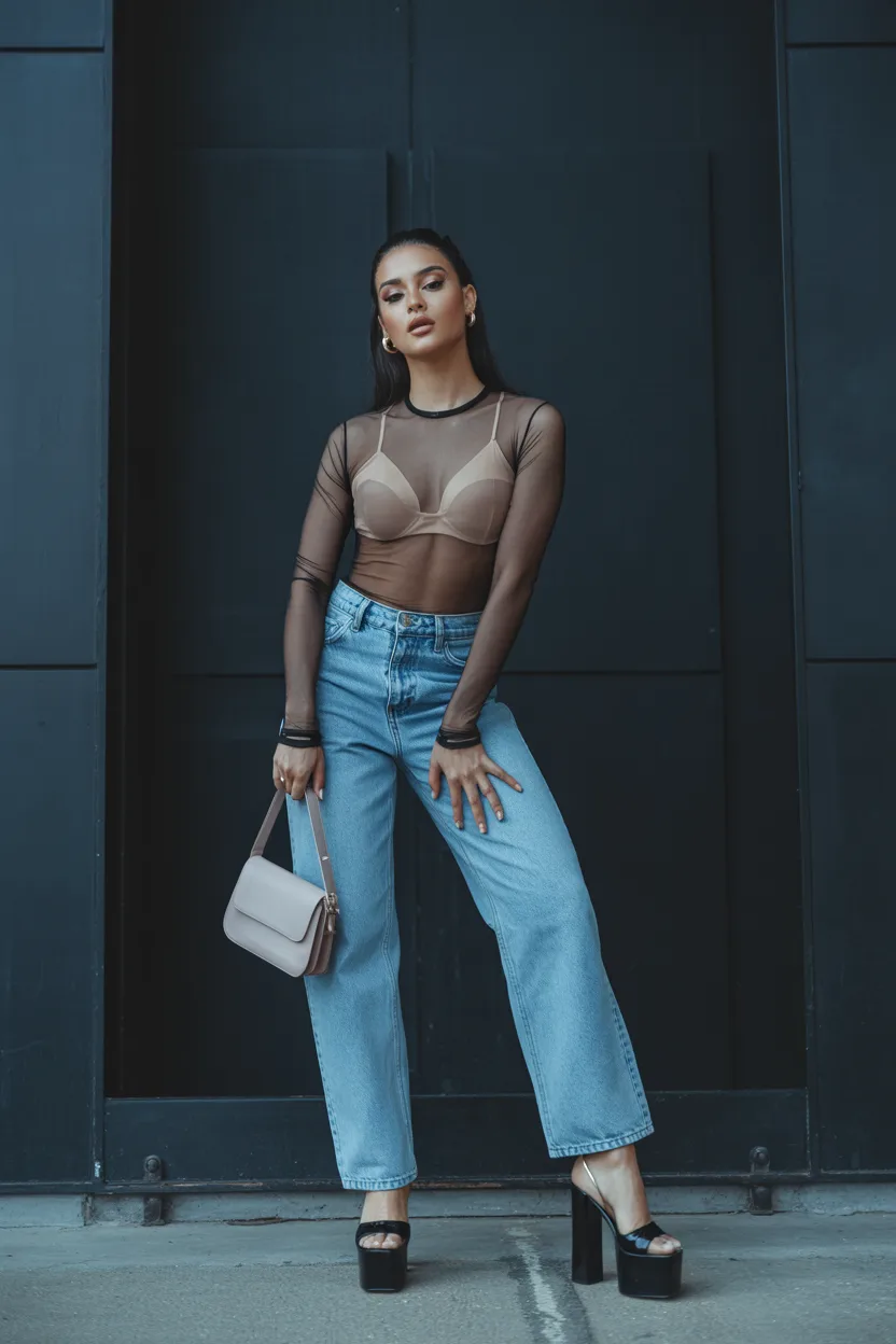 This outfit works well for nights out or any moment when you want to look a little more fashion forward. Add boots or platforms and keep the accessories minimal. A mesh top with a bralette and jeans gives you that classic Y2K confidence without making the outfit feel forced.