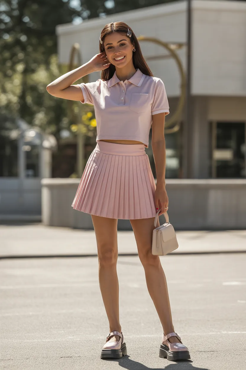 This outfit has that preppy Y2K energy that still looks fresh now. A pleated mini skirt brings movement and shape, while a fitted polo top keeps the look clean and a little sporty. It feels playful, polished, and very easy to style.
